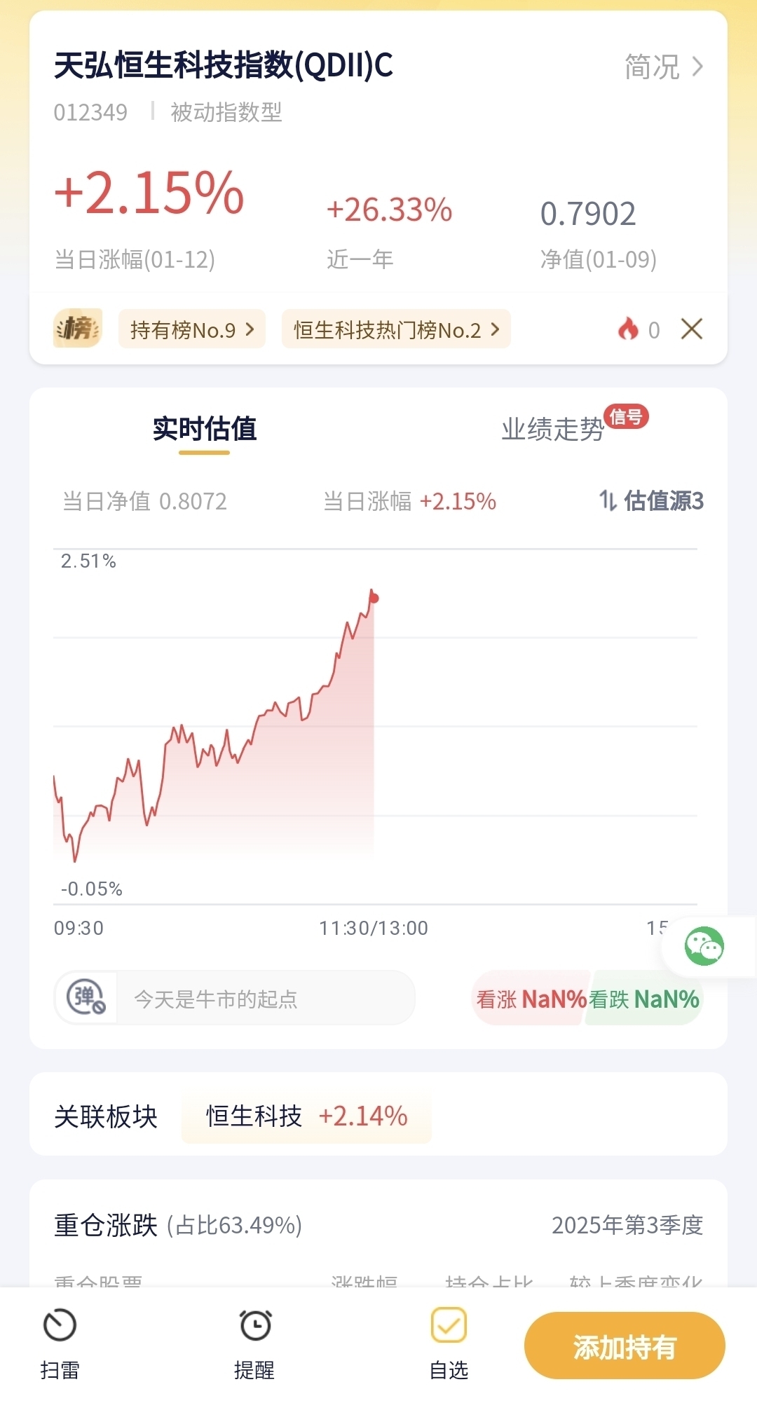 天弘恒生科技指数(QDII)今日预估涨幅+2.15%!