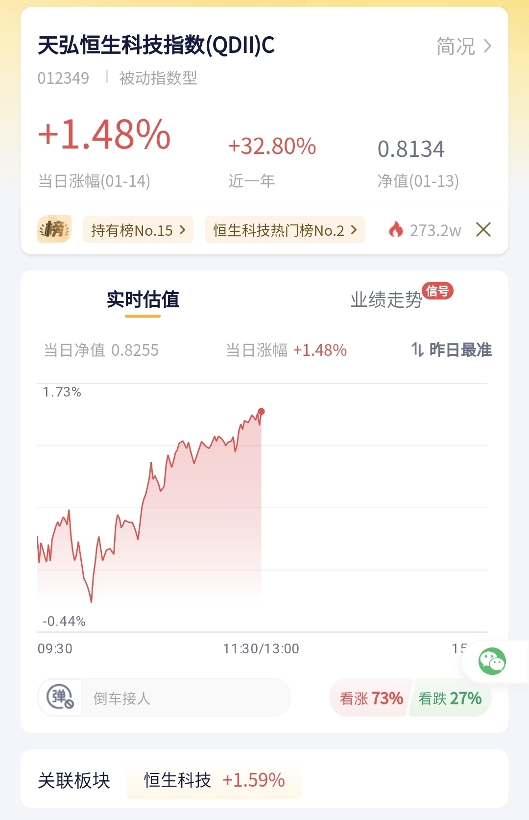恒生科技今天也跟着大市走暖,天弘这只指数基金预估涨1.52%。港股科技股今天迎来一波小反弹,互联网、科技龙头股都有不错表现,带动基金估值往上走。