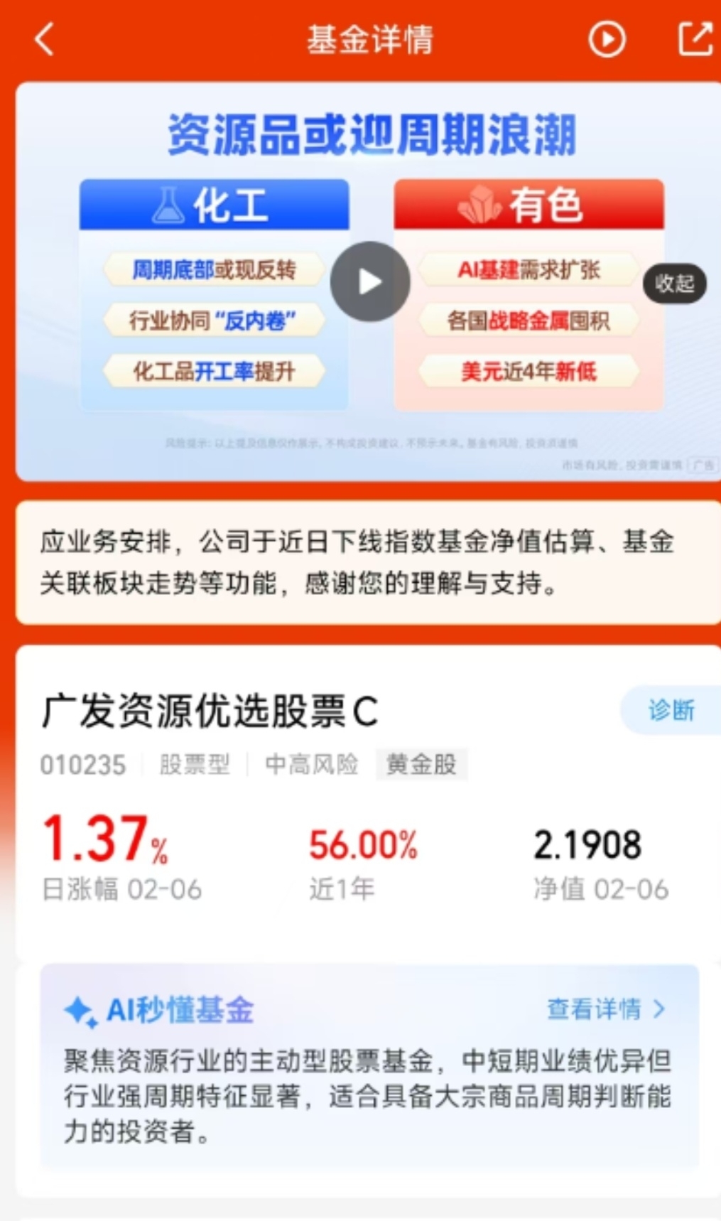对于资源板块,种类太多,与其费心猜测下一个暴涨的是谁,不如找个覆盖面广一点的工具。广发资源优选C重点化工+有色都有配置,攻守兼备,化工把握产业升级的结构性机会,有色捕捉宏观周期的波动机会,两者互补,能更平稳地分享资源行业的整体增长,在有色板块不怎么好的情况下,能反弹1.37%就是最好的证明$广发资源优选股票C$