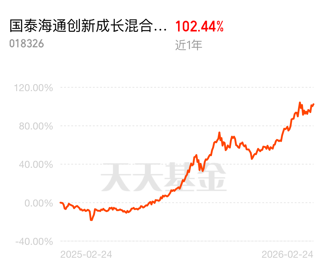 今天半导体继续走强,近一年累计上涨102%,近三月上涨37%,走势稳健,持有体验感还算不错呐$国泰海通创新成长混合发起C$