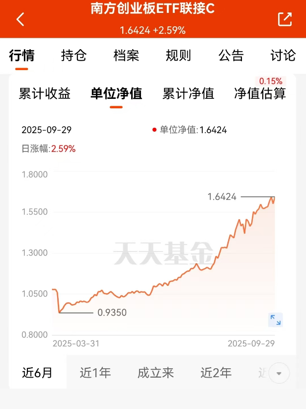 有人说现在涨多了不敢进,但其实看看创业板的估值,和历史高点比还不算特别夸张。这个$南方创业板ETF联接A$(002656)基金,近一年的夏普比率有2.1,说明风险调整后的收益还可以。它的运作方式是透明的,每天都能看到净值变化,重仓的标的也清清楚楚。我觉得在目前的市场环境下,通过这样的指数基金保持一定的参与度很重要,免得完全错过行情。定投或者分批买可能是应对波动的一种方式。#DeepSeek、寒武纪同步发布引关注#