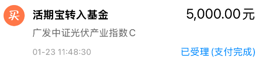 我加仓$广发中证光伏产业指数C(OTCFUND|012365)$ 5000元!终于突破了,跟踪的光伏产业指数这会看大涨超6%,直接突破了去年1111的高点,这里一旦站稳,就会打开新的上涨空间,我遵循趋势,抓紧上车一笔。