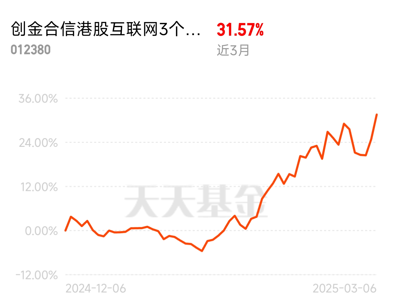 港股春季行情再次精准兑现,历史数据显示过去 13 年该规律从未失效!上周市场回调恰为战略布局良机,我果断加仓创金港股互联网基金。该产品近 3 个月收益率达 27.8%,超额收益显著,重仓股 AI 相关持仓占比超 65%。从四季报可见,其增持的阿里巴巴因与苹果共建 AI 生态,股价周涨幅达 15%,充分体现主动管理的行业前瞻性。据机构预测,至 4 月底政策窗口期前,港股科技板块或延续 30% 以上升幅,当前正是布局 "AI 牛" 的黄金阶段。$创金合信港股互联网3个月持有期混合(QDII)C$