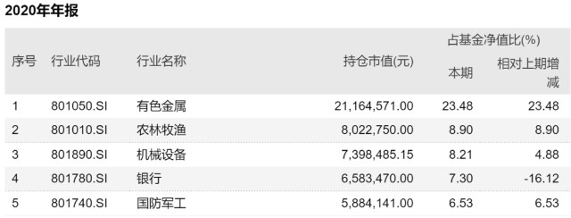 但是,董辰一上任,就做出了不一样的操作。2020年四季度,他在左侧对有色金属进行了布局,基金年报前三大重仓行业分别为有色金属、农林牧渔和机械设备。