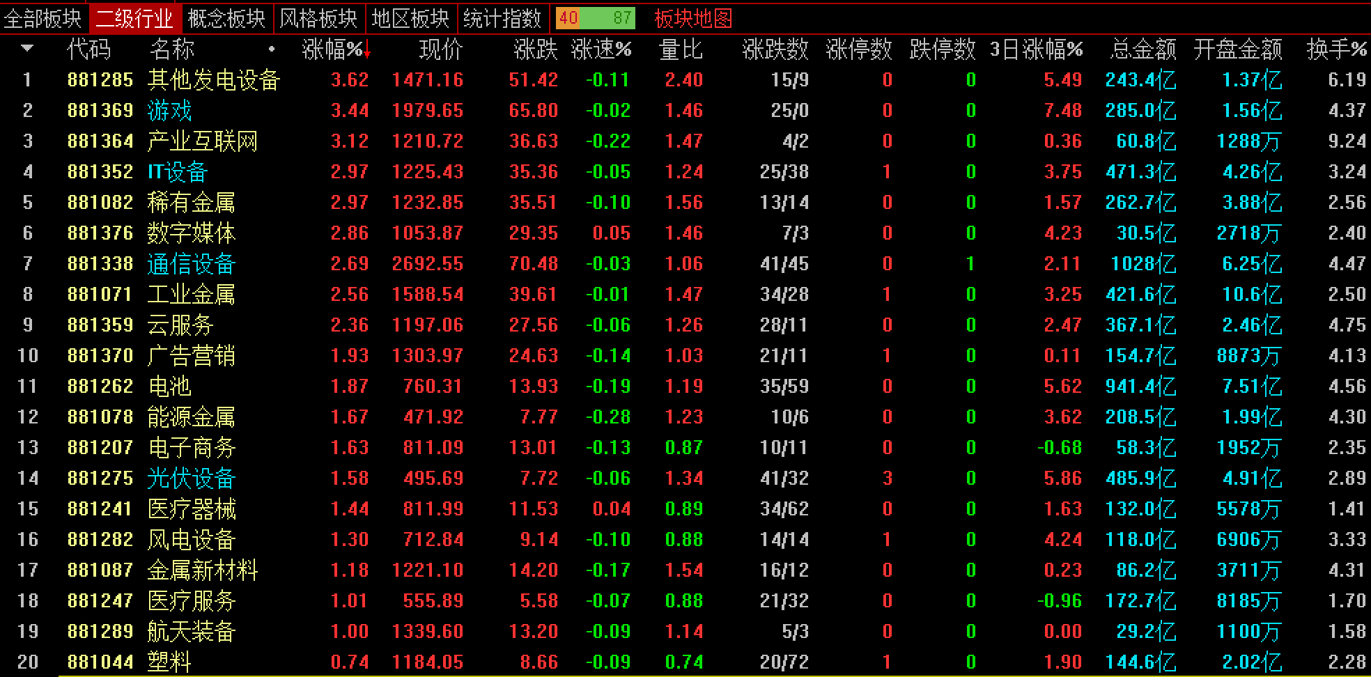 大盘这会儿主要是窄幅整理,没什么明显动静,这是典型的节前效应。现在市场流动性差不多被科技行业吸走了,虽然三大指数在涨,创业板还创了三年多新高,但沪深两市里,跌的个股还是比涨的多。#9月游戏版号发放 景气度或超预期#现在我们看看板块趋势: