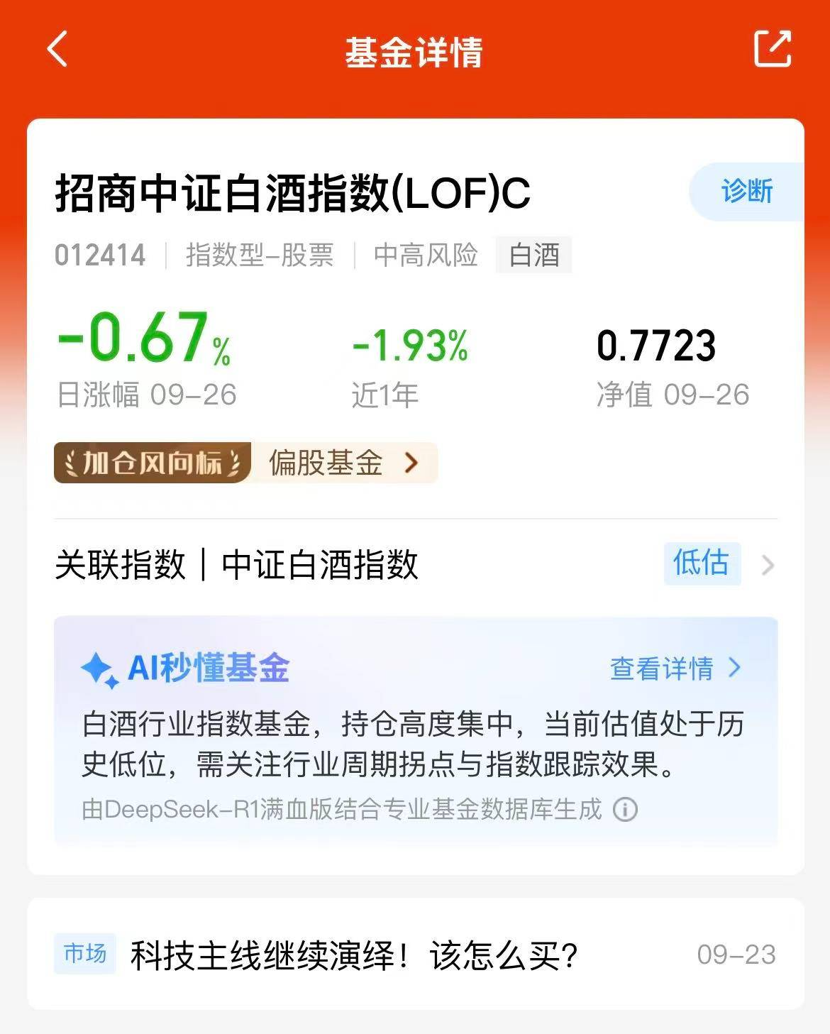 今天A股三大指数均反弹了,全市场有3700只个股上涨,盘面相当给力,医药今天反弹,消费赛道也低开高走,目前拉升的不错呢。$招商中证白酒指数(LOF)C(OTCFUND|012414)$估值上涨2.02%,是紧密跟踪中证白酒指数的,有山西汾酒、茅台、五粮液等等行业巨头,马上就到国庆中秋节日了,我觉得会有一波上涨行情的,所以我继续看好这个方向啦!