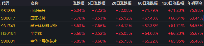双节假期,半导体成为美股乃至港股绝对亮点,区间费城半导体指数、港股芯片指数分别上涨7.7%、6.86%。几大半导体相关指数盘中均已涨超5%,其中中证半导体产业指数已涨超6%!