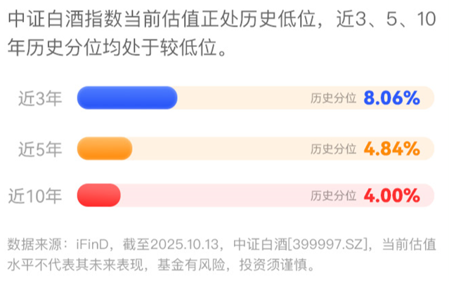 数据来源:iFinD,截至2025.10.13,中证白酒[399997.SZ],当前估值水平不代表其未来表现,基金有风险,投资须谨慎。