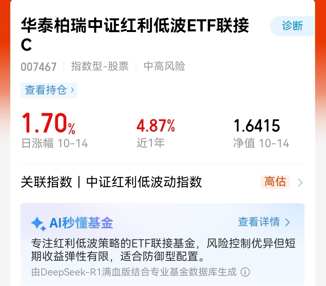 还可以,今天打开账户看到$华泰柏瑞中证红利低波ETF联接C$涨了1.70%,连续