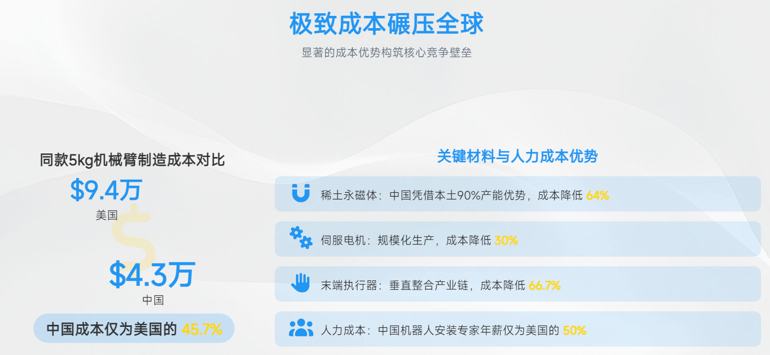 人力成本、材料成本、生产成本均比欧美国家低很多,加上全产业链优势和市场规模优势,使得国产机器人综合成本大幅低于国际平均水平。如宇树科技的 Unitree G1 版本售价仅为 9.9 万元人民币,相比国外同类产品价格低 90% 以上。