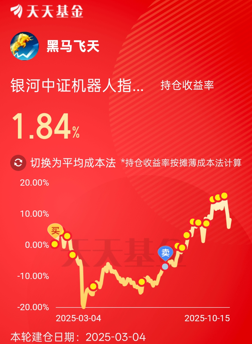 $银河中证机器人指数发起式C(OTCFUND|021302)$投了200多天,中间做了一次T,回调之后来到成本附近,继续定投加仓。