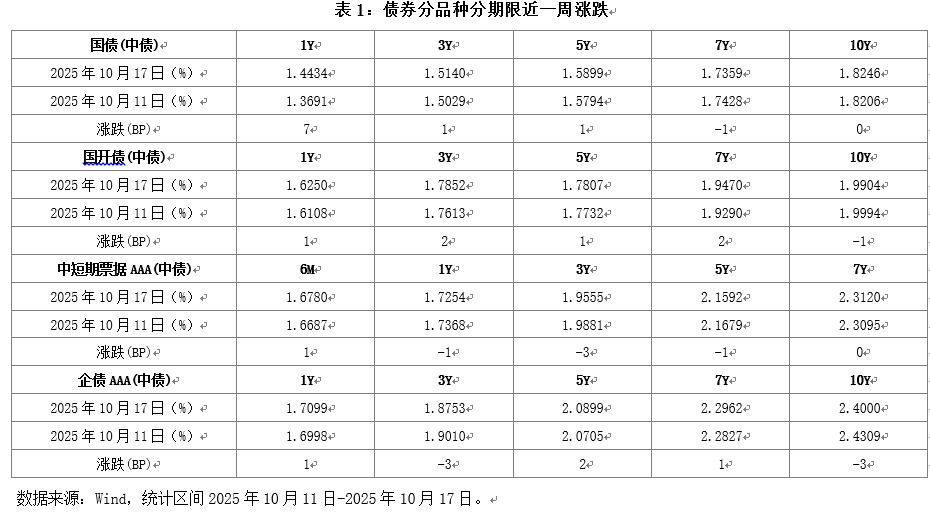 上周央行公告开展6000亿元买断式逆回购,全周大规模净回笼,银行间、交易所资金价格维持低位,前半周市场押注TACO交易,股债跷板效应明显,债市震荡偏弱运行;后半周权益市场大幅回调,债市迎来阶段性交易机会。资金方面,DR001、R001周均值分别较前周变动-0.34BP、+0.58BP,DR007、R007周均值分别较前周变动-1.58BP、-0.52BP;利率方面,截至10月17日,1Y、3Y、5Y、7Y、10Y、30Y国债收益率较前周收盘分别变动+7.43BP、+1.11BP、+1.05BP、-0.69BP、+0.40BP、-3.26BP至1.4434%、1.5140%、1.5899%、1.7359%、1.8246%、2.2002%;信用债方面,各主流品种收益率均下行,走陡趋势缓和,1Y、3Y、5Y、7Y、10Y中票利率分别变动-1.14BP、-3.26BP、-0.87BP、+0.25BP、-3.08BP,中短端信用利差收窄,中长端信用利差小幅走阔;二永债方面,各期限二永债利率普遍下行,中长端下行幅度大于短端。各品种主要期限上周涨跌详见附表1。