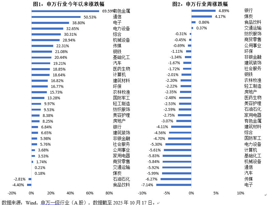 市场调整主要受内外因素共同作用:一方面,中美贸易摩擦再度升温、美国区域银行风险担忧等外部“黑天鹅”事件冲击全球风险偏好;另一方面,A股在前期上涨后存在技术性调整需求,获利了结压力显著上升。结构上看,避险情绪推动贵金属板块表现强势,金银价格上涨带动有色金属板块走强;同时,银行、煤炭等高股息、低估值的防御型板块继续受到资金青睐。而新能源、人工智能等热门赛道跌幅较大,既源于其前期估值偏高、交易拥挤度提升,市场对风险偏好变化更为敏感,也与部分企业三季报业绩不及预期、引发市场对盈利兑现能力的担忧有关。