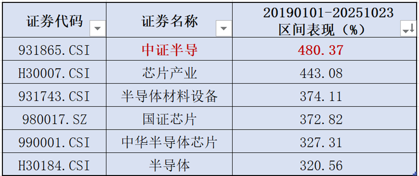 从长期表现来看,中证半导指数自2019年至2025年10月23日区间涨幅高达483.27%,在6个主流半导体指数中位居第一,显示出板块的高弹性与高成长性。