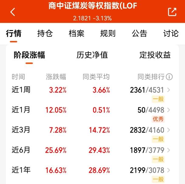 煤炭整体表现不错,又是上涨行情,随着近期北方地区气温持续走低,冬季电煤需求量激增,煤炭大省山西正加大煤炭增产保供力度,需求越来越大,煤炭行情会越来做好,$招商中证煤炭等权指数(LOF)C(OTCFUND|013596)$目前涨幅1.69%,近一个月涨幅12.05%,近六个月涨幅25.69%,业绩优秀。