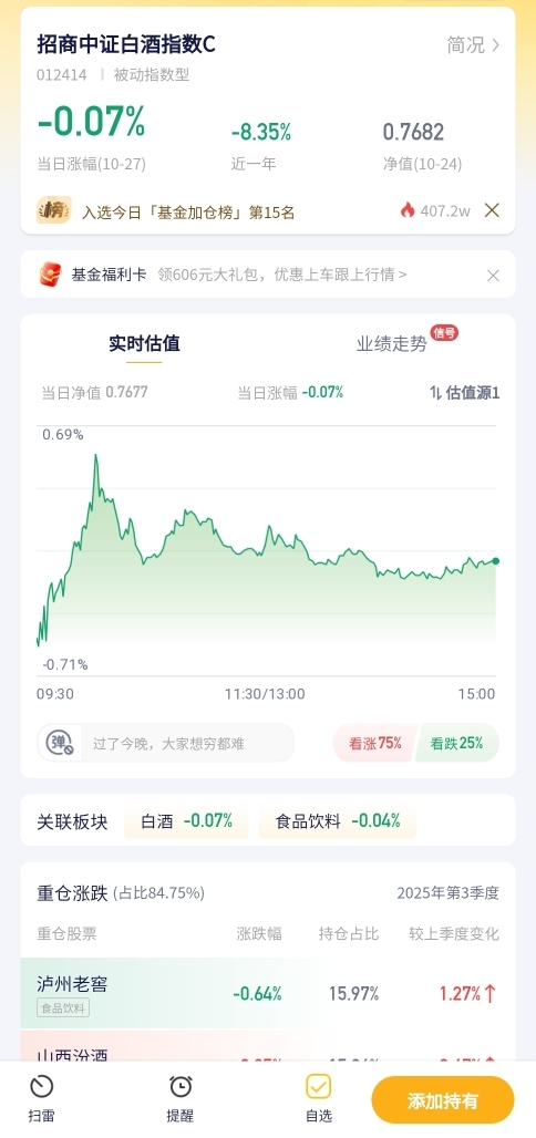 今日A股白酒板块表现疲软,这只基金微跌了点。白酒板块近期受市场消费预期等因素影响,资金信心不足,导致它小幅下跌。