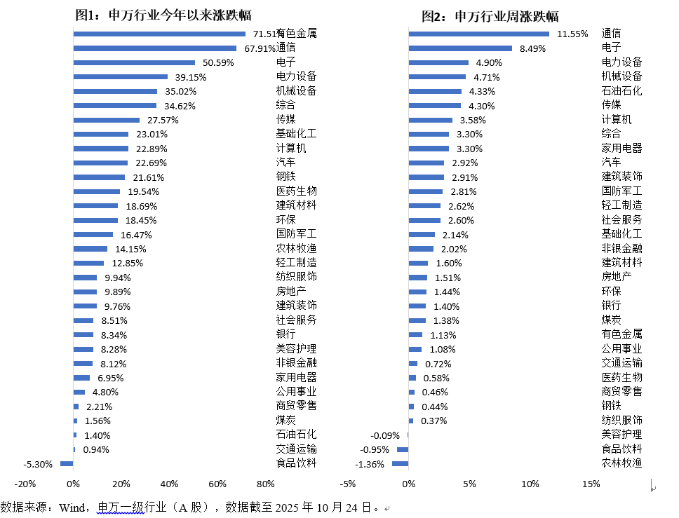 上周A股市场先抑后扬,前四个交易日指数整体震荡,交投活跃度下滑,周五随着重要会议落地以及地缘风险缓和预期升温,风险偏好回升推动沪指再创新高。上证综指报3950.31,上涨2.88%;深证成指报13289.18,上涨4.73%;创业板指报3171.57,上涨8.05%。从具体方向看,节后调整幅度较大的成长板块出现明显修复。海外算力受益于光模块需求提升以及产业加单催化,涨幅居前;重要会议明确科技自立自强为“十五五”核心发展目标,带动国产算力、半导体等板块上涨,新能源、军工等政策受益方向同样表现较优。总量政策定调仍以“稳”为主,注重调结构而非强刺激,与之相关的消费和地产链等政策博弈板块表现相对较弱。市场风险偏好提升促使风格切换,避险类资产整体承压,贵金属板块受地缘冲突缓和预期影响跌幅居前,交运、公用事业等稳定板块同样表现靠后。申万一级行业今年以来和近一周涨跌幅详见附图1和图2。