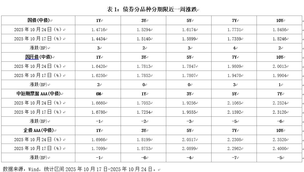 上周资金价格小幅抬升,分层压力略有加剧,国股行存单以提价为主,收益率曲线平坦化。资金方面,DR001、R001周均值分别较前周变动+0.19BP、+1.34BP,DR007、R007周均值分别较前周变动+0.36BP、-0.38BP;利率方面,截至10月24日,1Y、3Y、5Y、7Y、10Y、30Y国债收益率较前周收盘分别变动+2.82BP、+1.54BP、+2.75BP、+3.72BP、+2.40BP、+1.24BP至1.4716%、1.5294%、1.6174%、1.7731%、1.8486%、2.2126%;国债利差方面,10-1Y利差维持在38BP左右,10-7Y由9BP收窄至8BP,30-10Y由38BP收窄至36BP;信用债方面,以AAA级中票为例,短端利率下行为主,长端利率上行为主,整体曲线走陡,1Y、3Y、5Y、7Y、10Y中票利率分别变动-2.02BP、-2.99BP、-5.27BP、-5.96BP、-5.77BP,信用利差整体收窄3-9BP;二永债方面,二永债利率涨跌不一,各期限二永债利率在上下3BP震荡。各品种主要期限上周涨跌详见附表1。