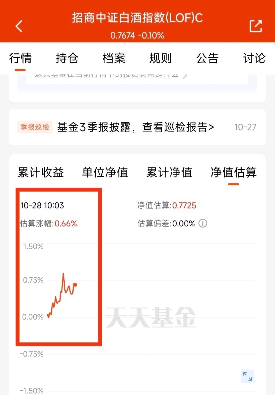而且最新规划里面有促消费的利好,坚持惠民生和促消费,要大力提振消费的利好催化。同时白酒的估值本身就很低,随着未来资金高低切换,其余的白酒有望迎来修复突破!$招商中证白酒指数(LOF)C$ 这支全市场最大的白酒指数基金。紧密跟踪中证白酒指数。持仓全部都是价值投资的白酒龙头代表。估值早盘上涨了0.66%。目前白酒整体估值低。性价比高。修复的空间比较大。现在在底部开始明确。我也准备布局了。