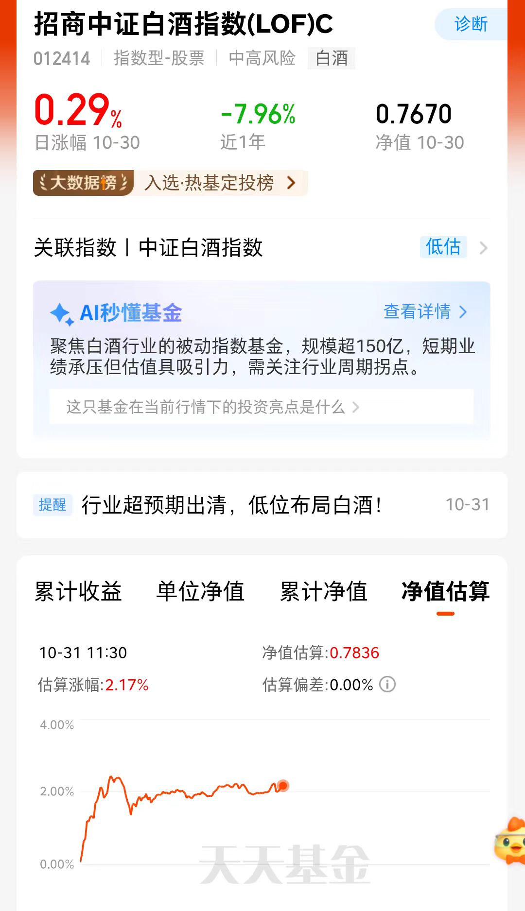 酒文化一直都是大家常谈话题,当然也还有$招商中证白酒指数(LOF)C(OTCFUND|012414)$,有人看好,有人不看好,今天市场高低切,行情转换到白酒啦。这只今天盘中估值上涨2.17%,修复近一周的跌幅,期待继续补涨。