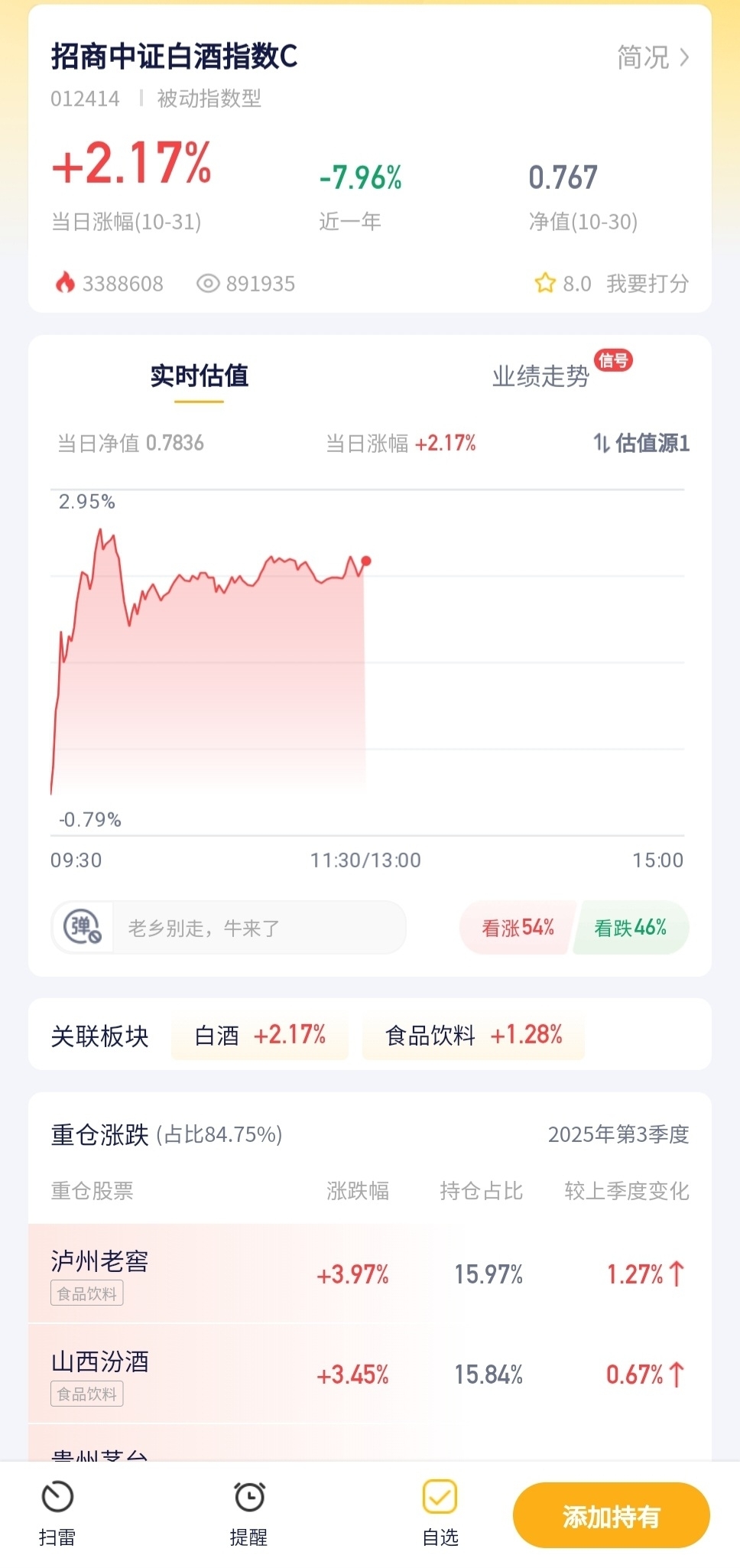 招商中证白酒指数C今日预估涨幅+2.17%!
