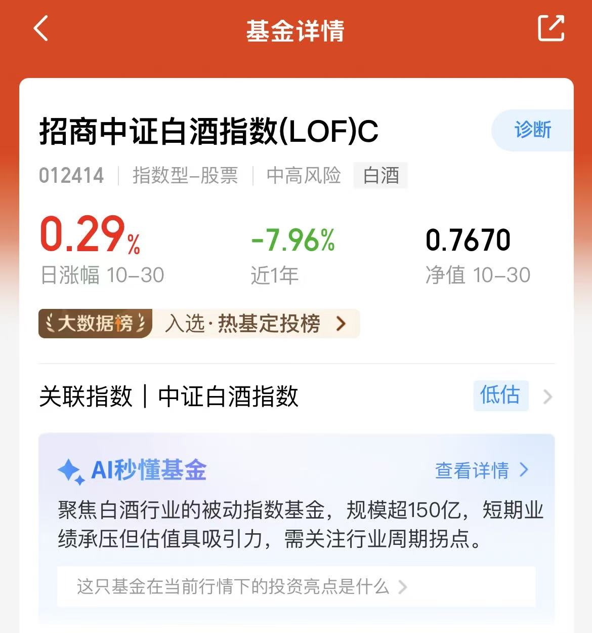 今天大盘又震荡了,绿油油的盘面呀,科技大调整,不过消费赛道近期表现不错呀,看来行情板块轮动到消费的,所以说消费是要有耐心的!$招商中证白酒指数(LOF)C(OTCFUND|012414)$目前估值上涨2.09%,这是覆盖白酒行业龙头的,重仓有贵州茅台、五粮液、山西汾酒、古井贡酒等等,都是龙头知名企业,我也终于等到吃肉肉啦!