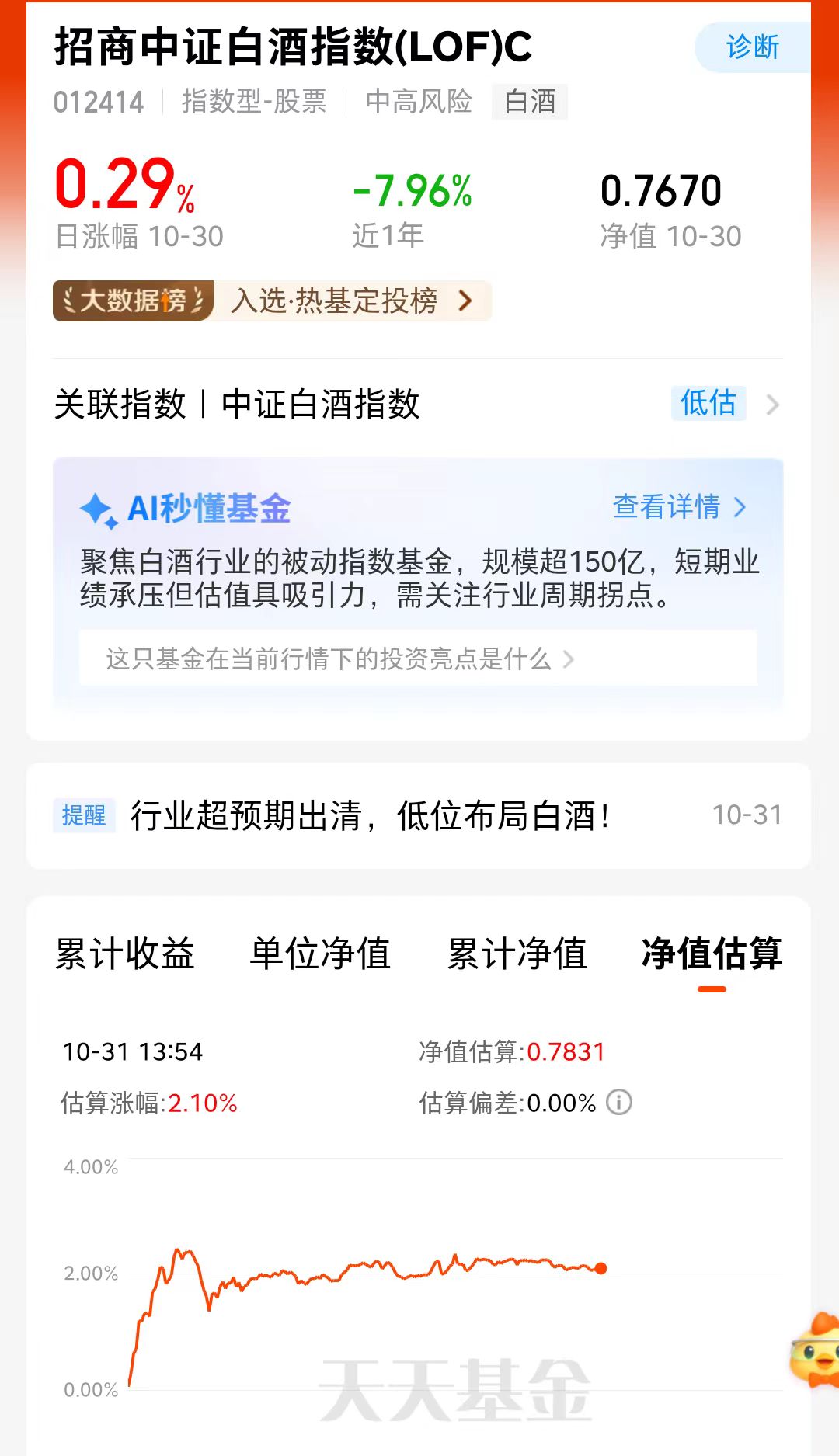 今天股市行情继续调整,但是市场高低切,不仅创新药赛道反弹,白酒也逆势上涨呢,$招商中证白酒指数(LOF)C(OTCFUND|012414)$已经经历过长期的回调了,估值已经显著回落,市场情绪处于低位,优质资产底部逻辑清晰。而且现在临近年底,消费需求升温,所以我觉得白酒板块有望迎来估值修复呢,