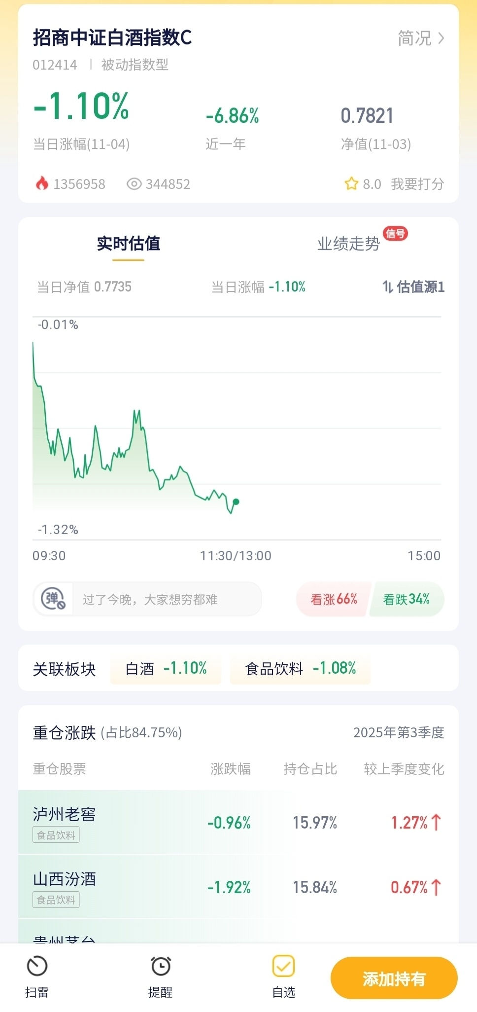 招商中证白酒指数C今日预估跌幅-1.10%!