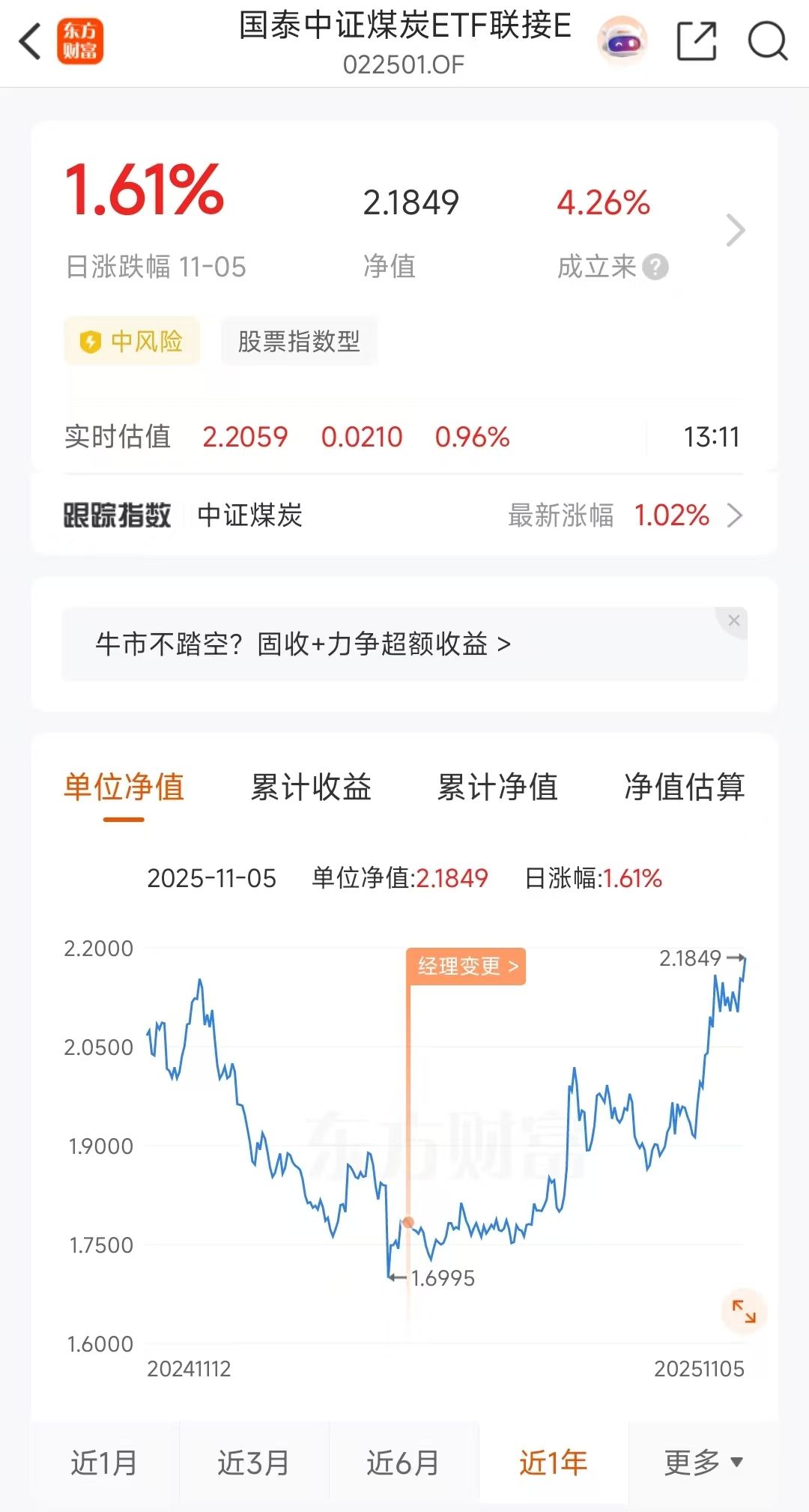 市场反弹背景下,煤炭板块的防御价值愈发凸显。中证煤炭指数当前股息率达4.99%,在市场量能萎缩、资金观望情绪浓厚的环境中,高分红属性成为避险资金的“避风港”。资金的持续配置让板块反弹根基扎实,$国泰中证煤炭ETF联接E$(022501)实时估值上涨1.08%,上涨确认价值吸引力,后续还将吸引更多长期资金进场,抓紧布局。#科技热点摊开业啦#