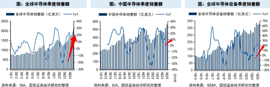 半导体设备方面,2025年三季度全球半导体设备销售额达331亿美元,同比增长23.5%,环比增长3.2%。市场预期,全球半导体销售额将在2025年达到7280亿美元,同比增长15.4%,2026年有望突破8000亿美元,并在2030年前冲击1万亿美元规模。