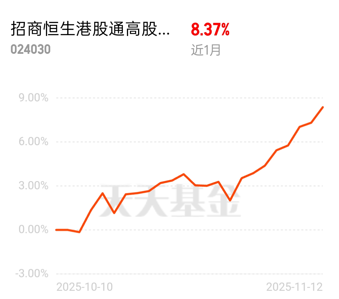 现在投资都讲究稳字当头,那些波动大的产品让人心里没底,高股息低波动才靠谱。招商恒生港股通高股息低波动ETF联接C近1个月收益8.37%,跟踪的指数金融地产占比超60%,低波动特性突出,6%高股息+定期分红,低费率持有更便利。$招商恒生港股通高股息低波动ETF发起式联接C$