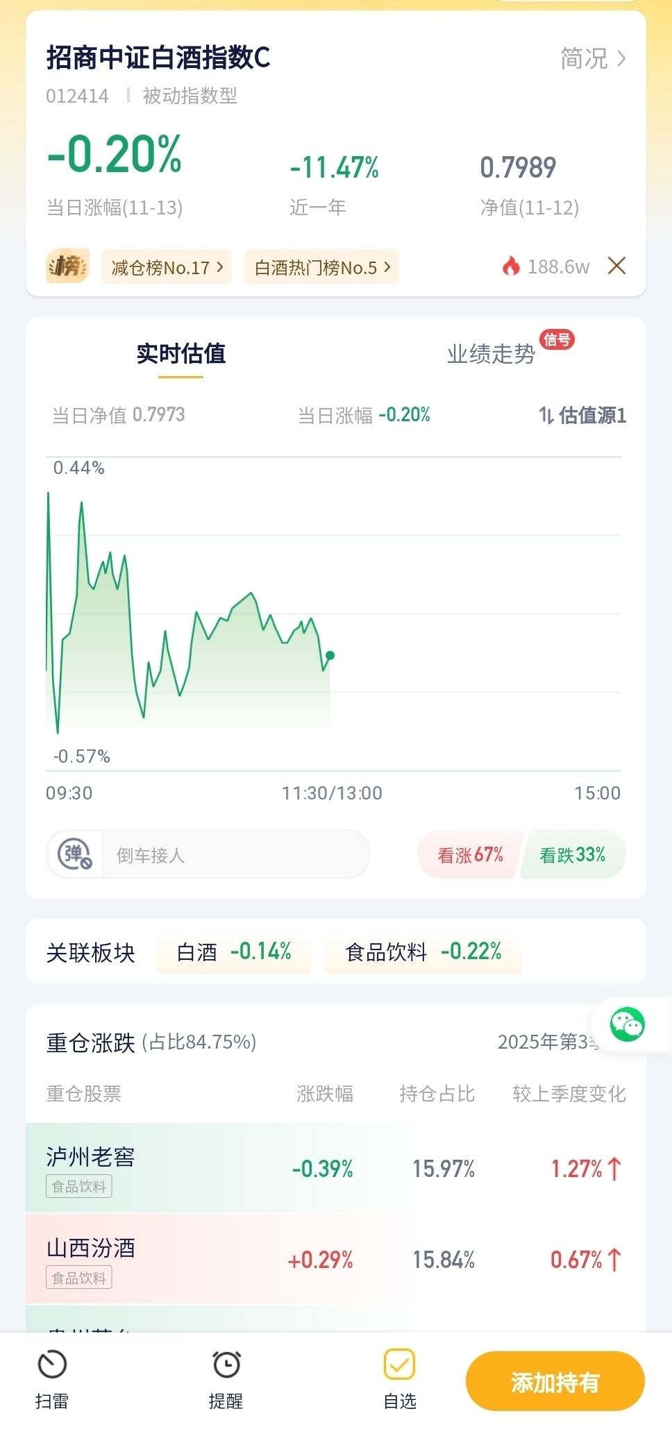 - 招商中证白酒指数C今日预估跌幅0.20%!