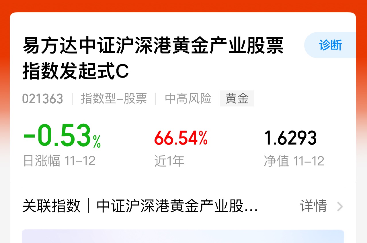 利好慢慢释放出来,黄金涨得超带劲,这只比同类业绩靠前些 $易方达中证沪深港黄金产业股票指数发起式C$
