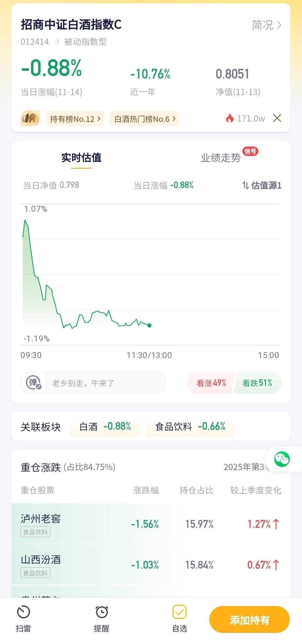 - 招商中证白酒指数C今日预估跌幅-0.88%!