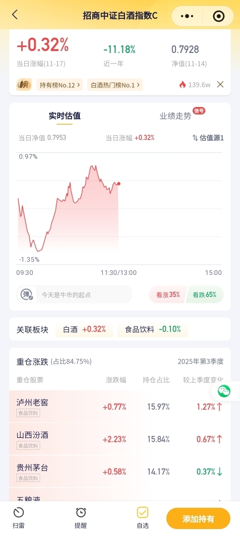 招商中证白酒指数C今日预估涨幅+0.32%!