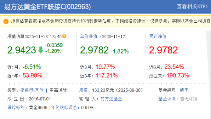 对应到 易方达黄金 ETF 联接 C$易方达黄金ETF联接C(OTCFUND|002963)$,这只基金近 1 年涨 53.98%,远超同类平均的 44.26%,业绩弹性在黄金类产品里相当突出。它精准跟踪黄金 9999 指数,持仓完全绑定金价波动,最大回撤仅 10.39%,防御性也足够稳。