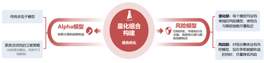 指数增强组合构建策略由Alpha模型和风险模型构成,通过组合优化技术追求实现投资目标。Alpha模型旨在争取超额收益,主要采用传统多因子策略,辅以灵活性更高的卫星策略。风险模型旨在控制组合的跟踪误差,并使组合在市值、风格等方面与跟踪指数更为接近。