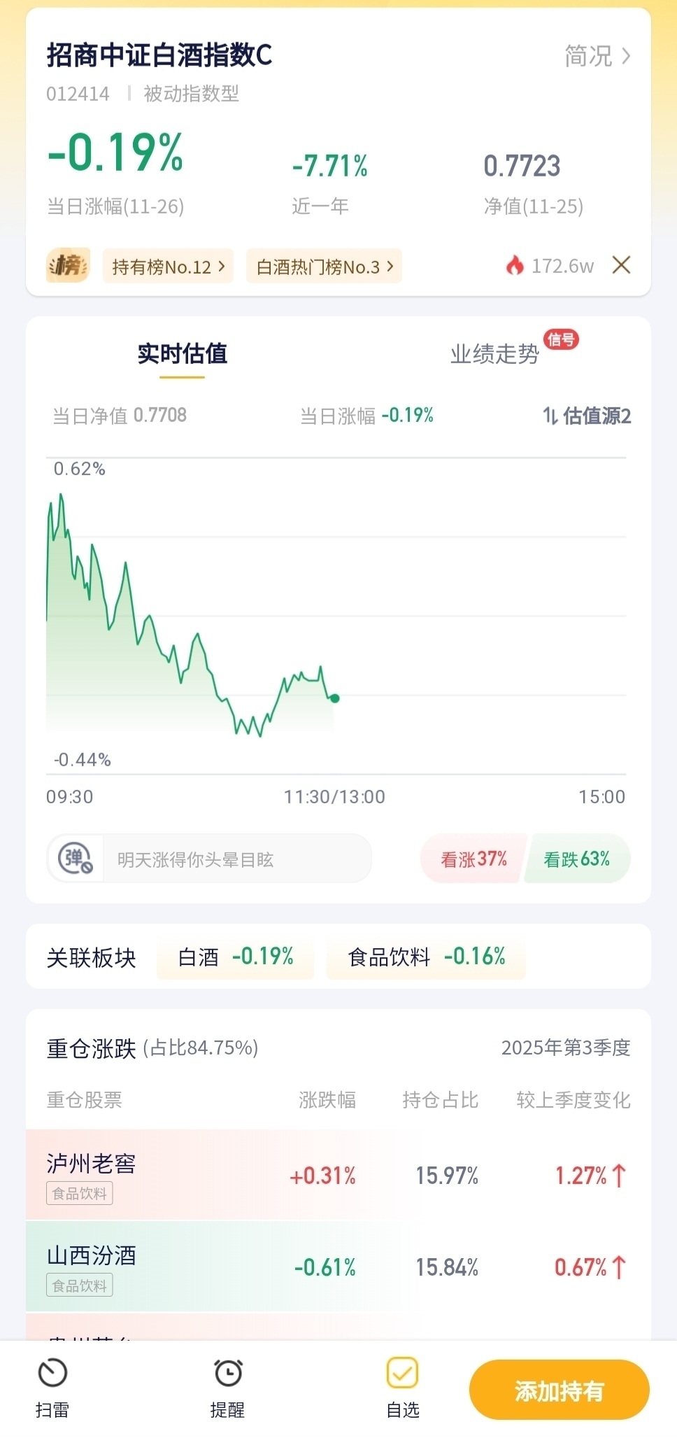 招商中证白酒指数C今日预估跌幅-0.19%!