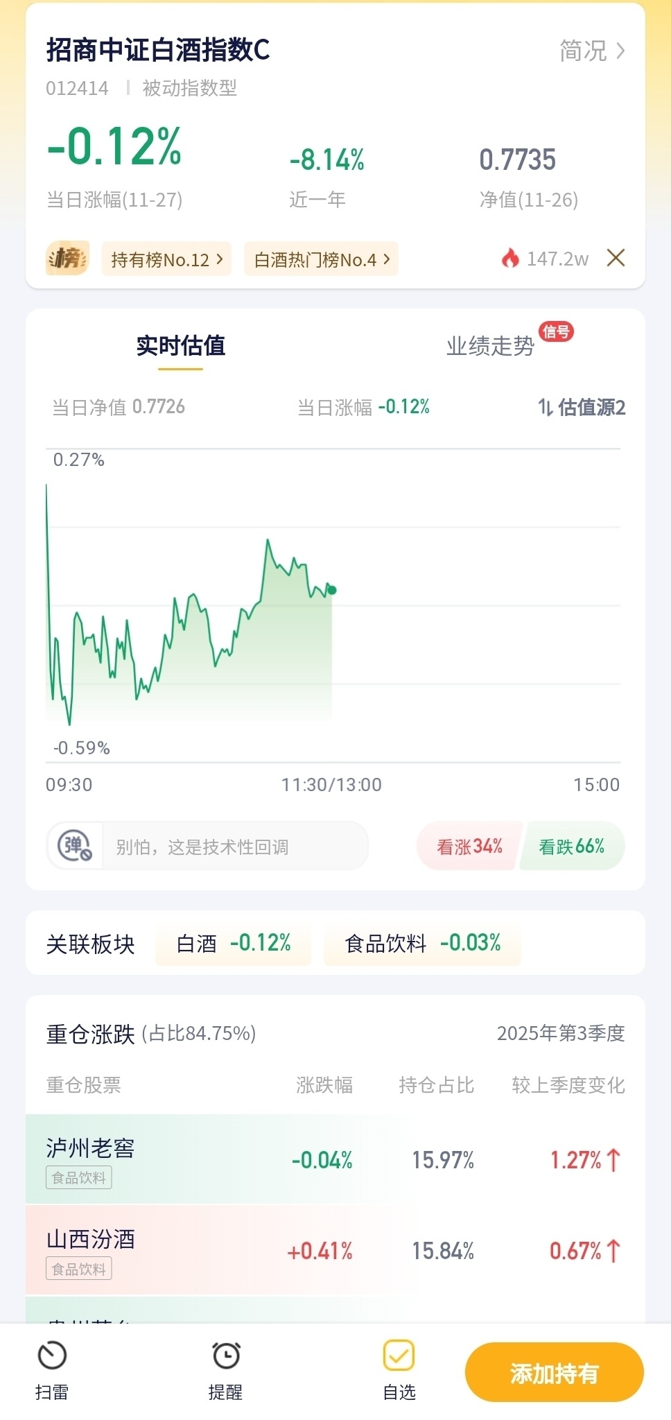 招商中证白酒指数C今日预估跌幅-0.12%!