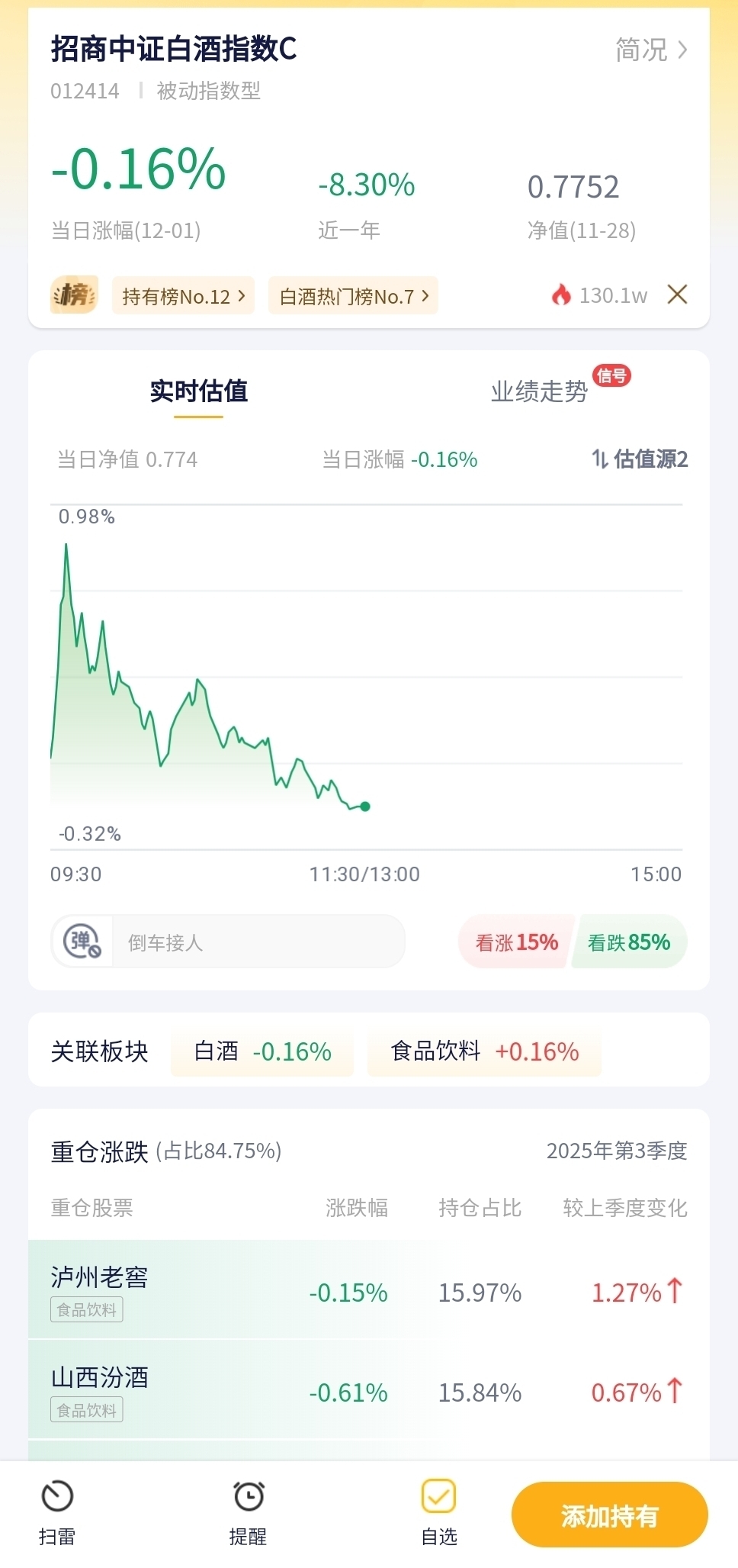 白酒今天稍微蔫了点,这只指数基金跟着跌了0.16%,幅度不算大,算是小范围的震荡调整。