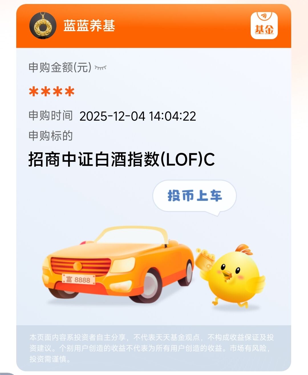 白酒近期一直在调整,我今天果断加仓了。从长期来看,白酒的优秀商业模式没变化,头部企业高分红能提供基础回报,而且现在估值和持仓都在低位。随着政策发力、经济慢慢回暖,白酒需求端大概率会修复,后续还是很值得期待的。我选的是$招商中证白酒指数(LOF)C(OTCFUND|012414)$今天已经开始定投100元。