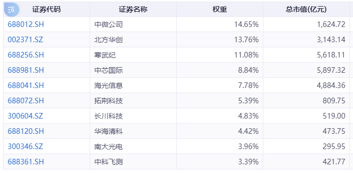 中证指数官网数据显示,中证半导体设备指数(931865)中“半导体设备”含量超5成,设备+材料+集成电路设计三行业占比超9成,均为国产替代的关键领域。从重仓股来看,指数重点布局中微公司、北方华创、寒武纪、中芯国际、海光信息等产业龙头,前十大集中度近8成,高弹性特征较为突出。
