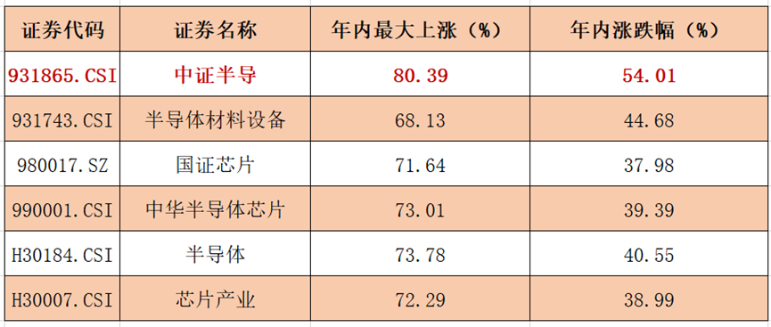 截至昨日,2025年中证半导指数年内涨幅为54%,区间最大上涨超80%,在中华半导体芯片、国证芯片、芯片产业等主流半导体指数中位列第一,弹性突出。