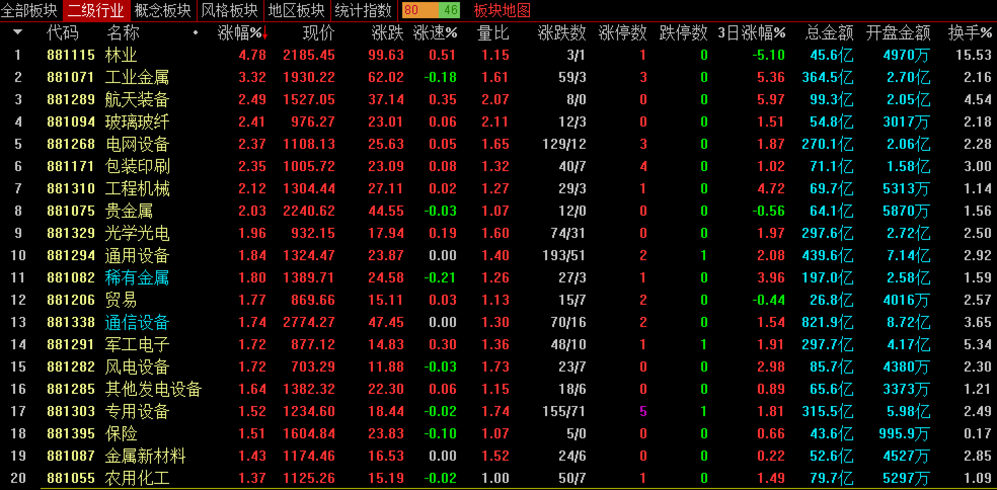 今天沪指低开后往上走,但银行几乎单边调整,房地产还在走低,对市场拖累不小。好在有色、保险这些权重板块拉升,稍微对冲了部分压力。沪指已经连续两周窄幅震荡了,而且一直处于 20 日均线之下的弱势区间。现在我们看看板块趋势: