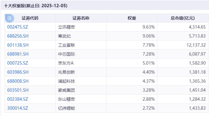 消费电子主题ETF联接(A:016007 / C:016008)追踪中证消费电子主题指数(931494),截至12月5日,该指数年内累计涨幅超40.7%,展现出较强的增长潜力。其前十大成份股包括立讯精密、寒武纪、工业富联、京东方A等消费电子领域核心企业,覆盖了行业上下游的优质标的。