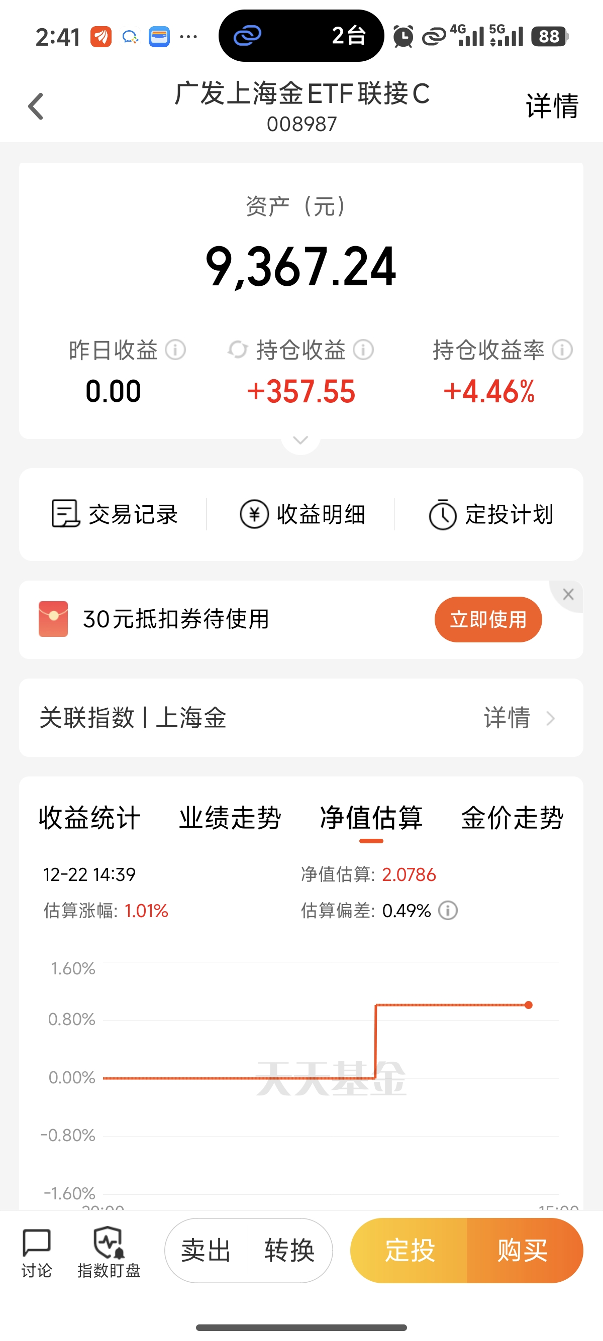 上海金今天估值涨 1.01%,$广发上海金ETF联接C(OTCFUND|008987)$ 的持仓收益已经冲到 4.46%,小沐今天转 1000 元继续加仓 —— 这波布局正好踩中黄金的避险 + 通胀逻辑。看当下行情,全球地缘局势的不确定性还在发酵,加上美联储降息预期升温,黄金作为避险资产的需求持续走高;