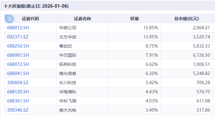 半导体产业ETF联接基金(A:020464 / C:020465)跟踪中证半导,标的指数以“设备”属性为核心,半导体设备、材料及上游设计等领域合计占比超90%,其中设备含量近60%。前十大权重股集中了北方华创、中微公司、中芯国际等产业链各环节的龙头,集中度接近80%,龙头效应显著。