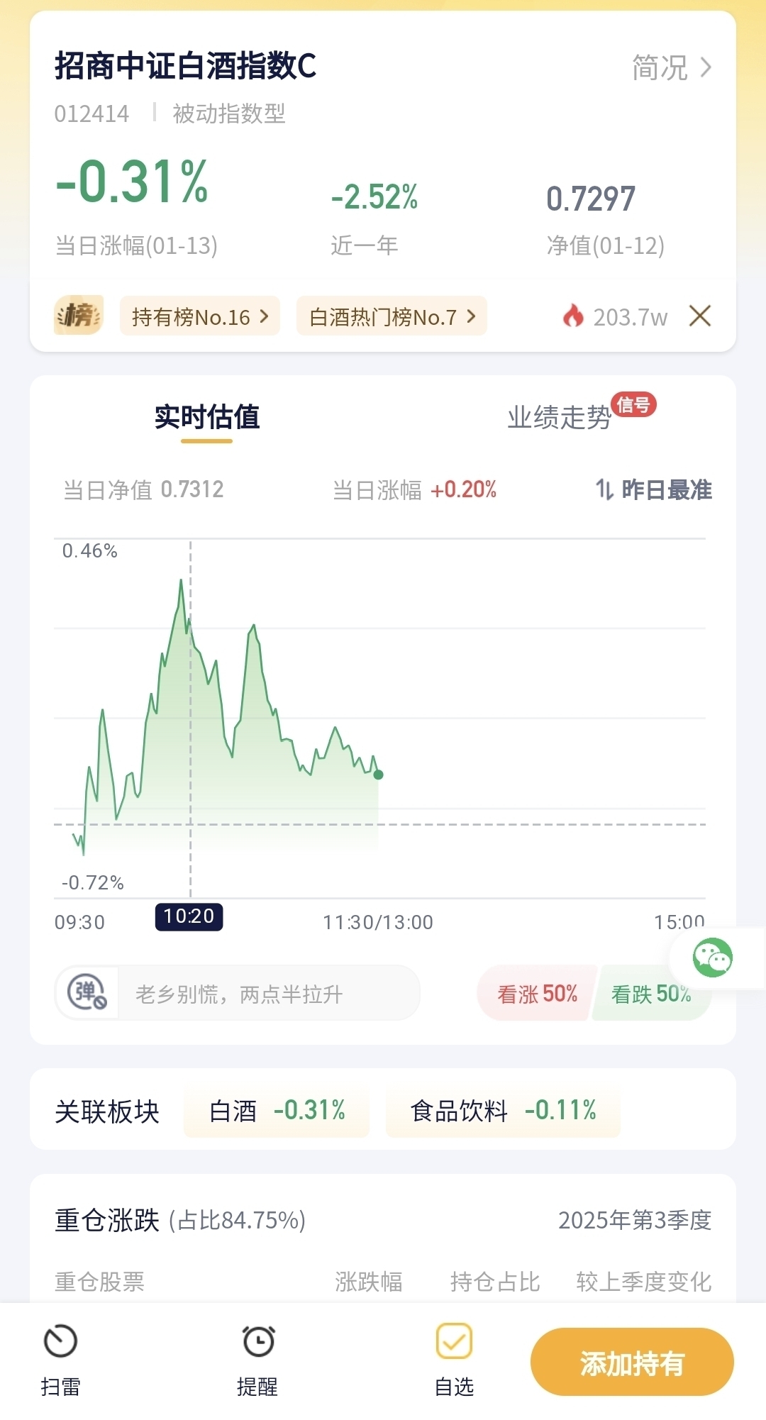 招商中证白酒指数C今日预估跌幅0.31%!