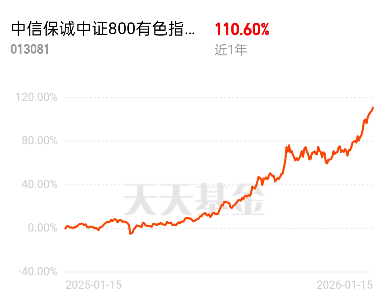 金属价格持续走高,有色板块开盘领涨势头强劲,稳稳五连阳。中信保诚中证 800 有色指数 (LOF) C 近 1 年涨 110.60%,稀有金属含量高,价值潜力持续释放,讨论区福利红包还在,赶紧来看看。$中信保诚中证800有色指数(LOF)C$