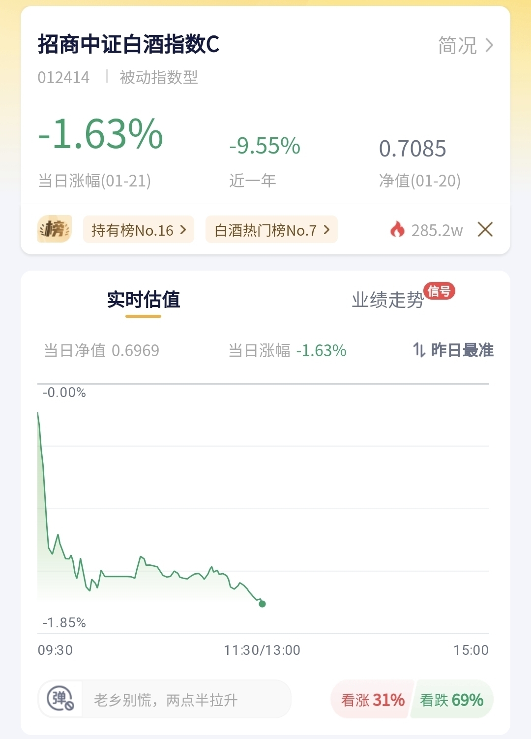 招商中证白酒指数C今日预估跌幅1.63%!